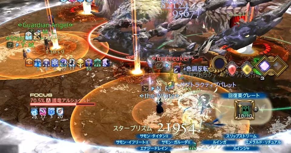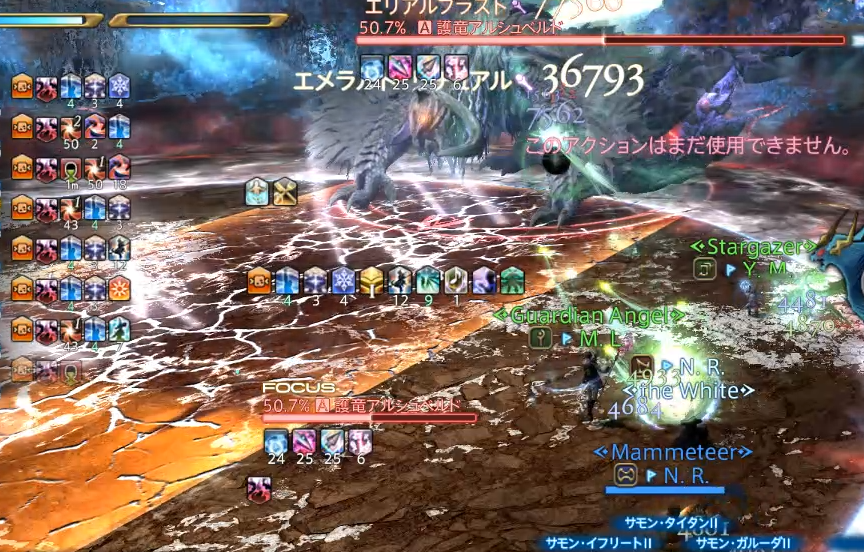 同時に円形範囲攻撃が来ており、左は、完全に塔の処理位置に、円形範囲攻撃を重ねてしまっていることが分かると思います。