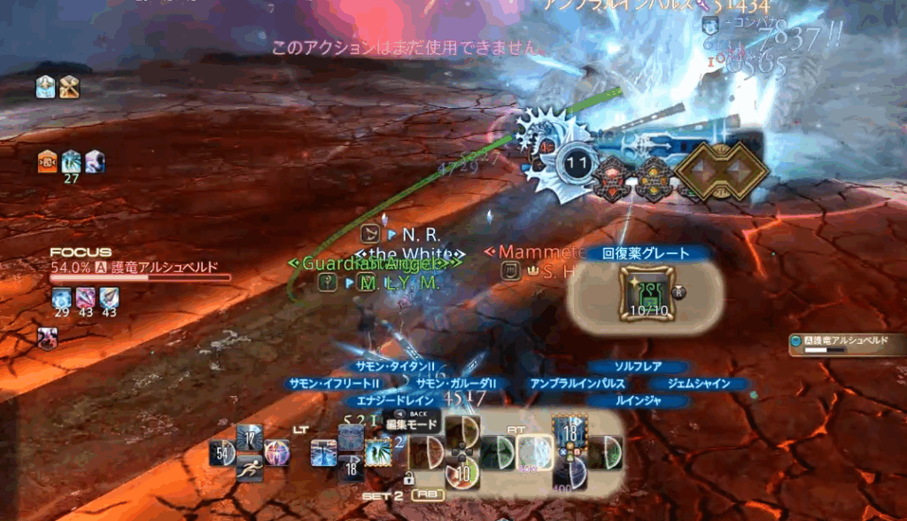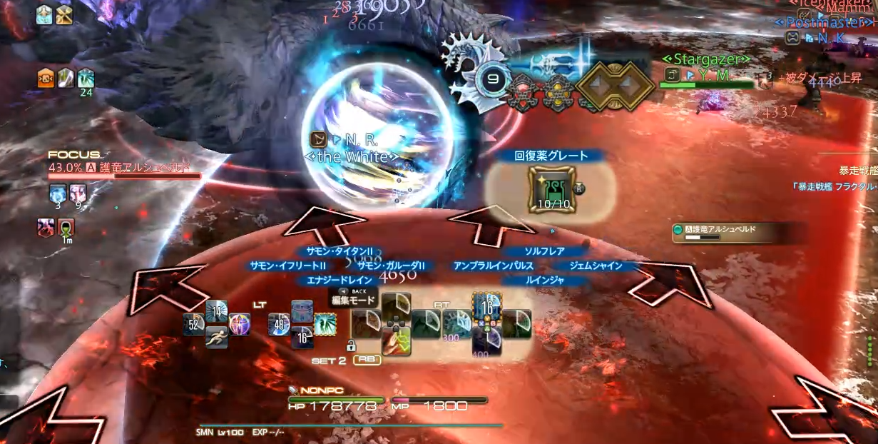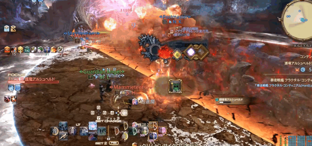 下のSSが攻撃判定なのですが、フィールド半面+ボスのターゲットサークルくらい反対側にも出ているのが分かると思います。