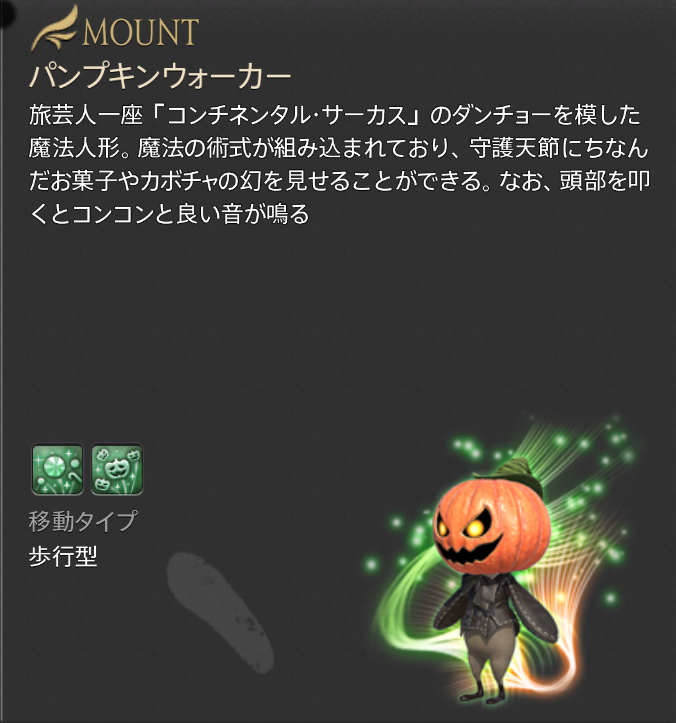 クエスト自体の報酬は、パンプキンウォーカーという、専用アクションが2つも付いているマウントです。