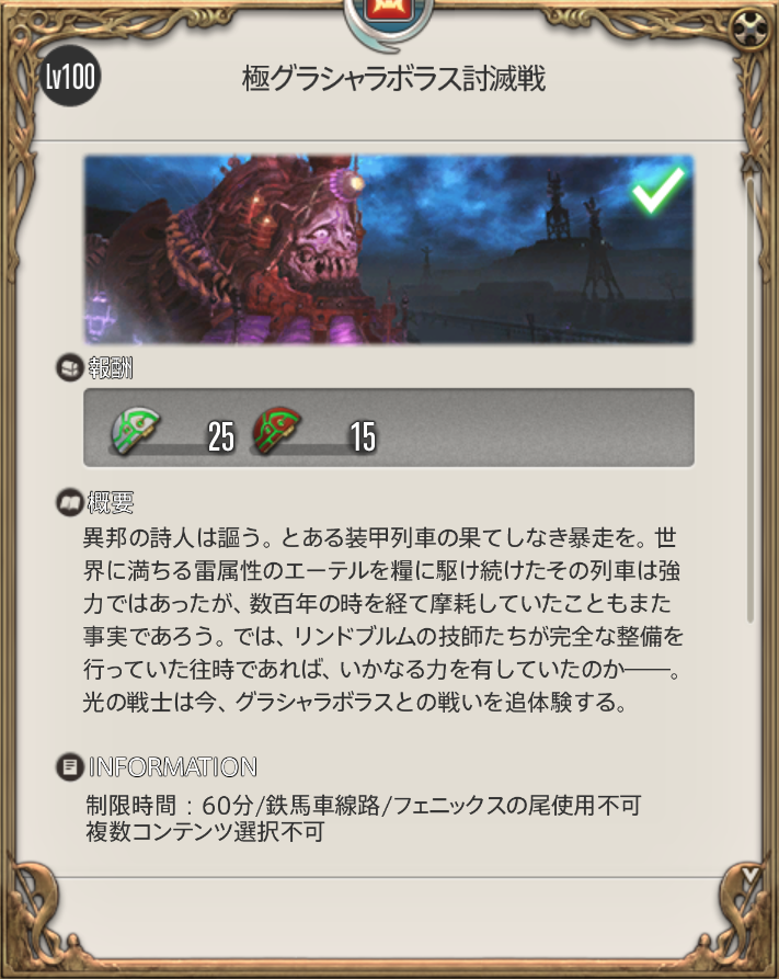 解放条件は、メインクエスト「隣人と手を取り合いて」をコンプリート後に、トライヨラ (X:11.1 Y:14.6) にいるNPC“異邦の詩人”に話しかけると、「極グラシャラボラス討滅戦」に挑戦できるようになります。