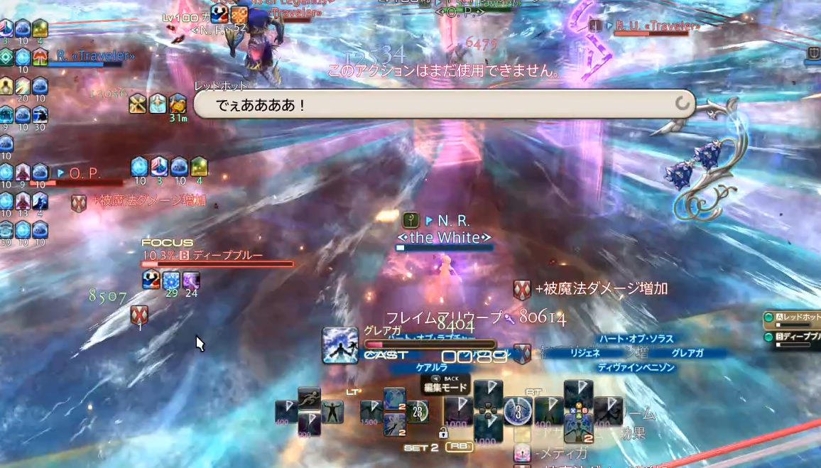 白魔で、青ボス対岸パターンが、どうしても安定しない場合は、テンパランスをここに持ってきて、タンク側のDPSには、タンクからもバリアを投げてもらい、4:4頭割りの前後に、自分側の4人をケアルガでぶん殴ると、最悪自分側はどうにかなります。