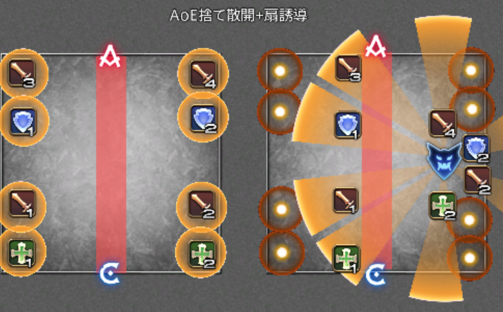 重要なのは、右側の図で、8人全員指定の扇状範囲攻撃の処理位置です。
