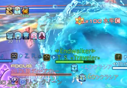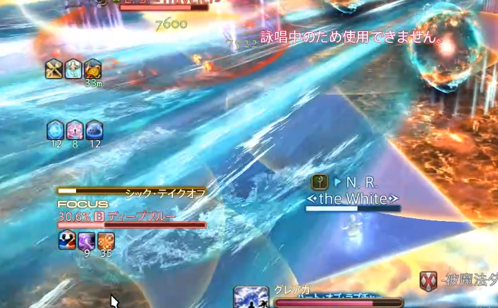 「インセインエアー」詠唱で出現するサーフボードのマーカーの角度が、攻撃の種類の予兆になった4連続攻撃に加えて、8人全員に色バフがつきます。