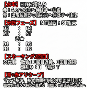 画像のパターンは、開幕にフィールド右方向に青ボスが移動したパターンで、フィールド右側チームは、今までと同じやり方で行けます。