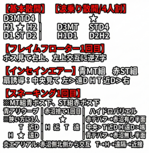 開幕4:4で、MTチームが青ボス、STチームが赤ボスの足元に集合してから、以後、各自のデバフの色に対応したボスの処理です。