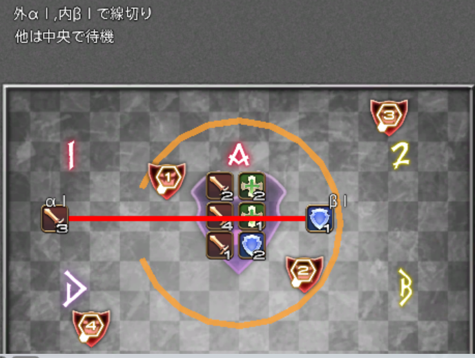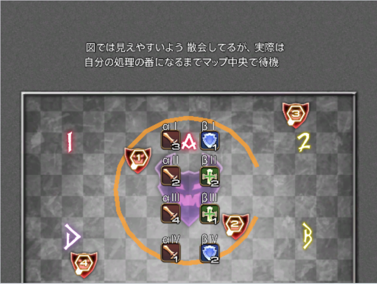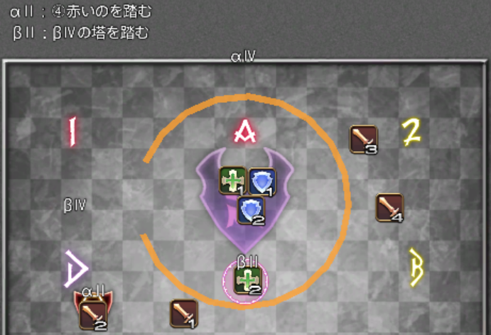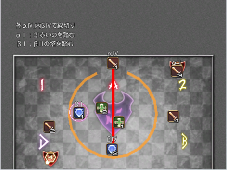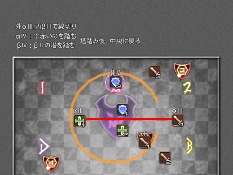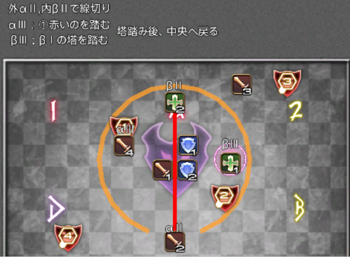 β担当は、自分が踏むべき塔の発生を見逃さないことと、αの線切り時の爆発(小円範囲)に巻き込まれないよう、しっかりと内側に寄っておくことが重要です。