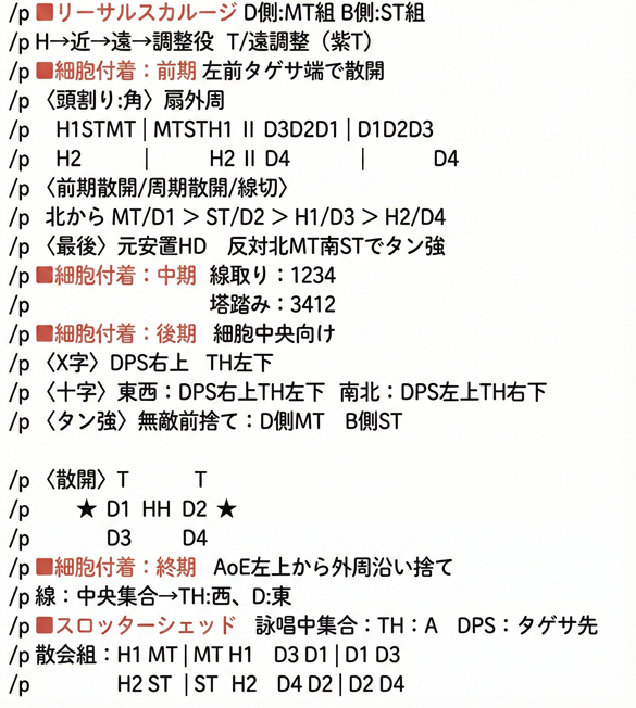 塔を処理したら、マクロ指定の位置で、タンクは直線範囲を誘導して捨て、DPSは円形範囲を散会して捨てます。