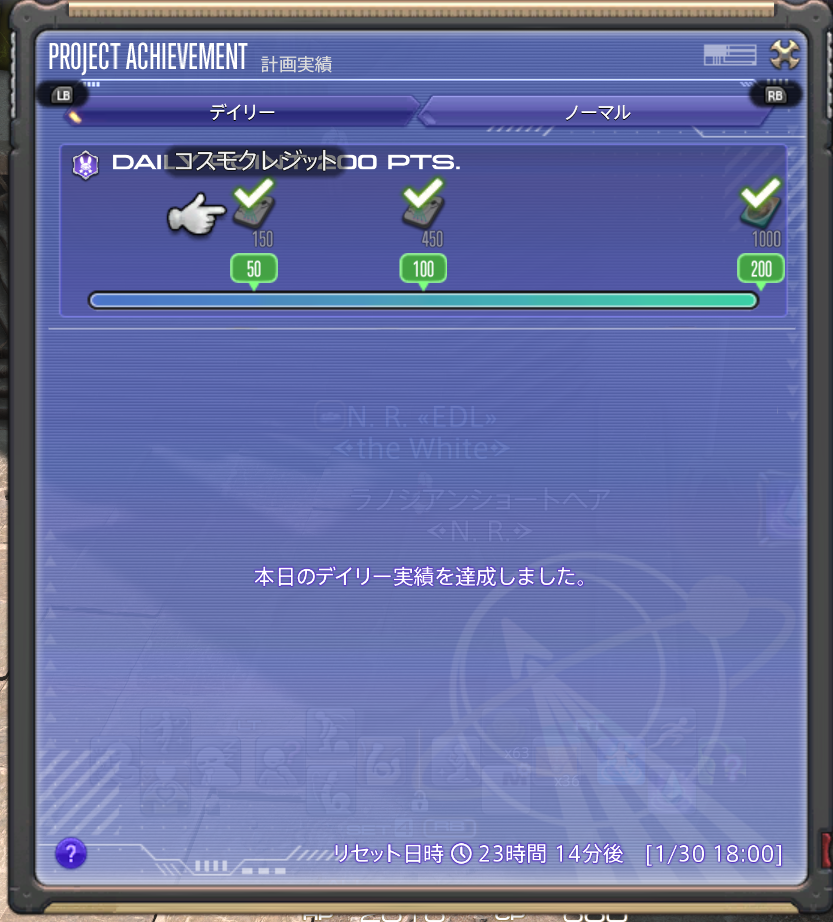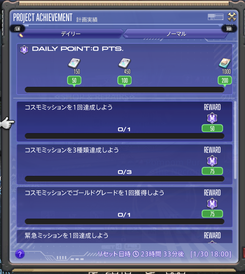 計画実績のデイリーのクリアがお勧めの理由は、5分もかからず、コスモクレジットが1000もらえるためです。