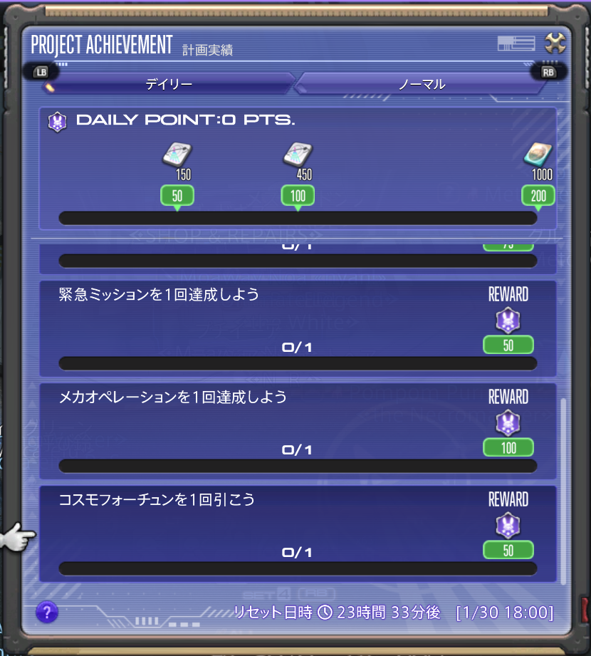 物凄く簡単で計画実績のデイリーのクリアと、メカオペレーションへの参加だけです。