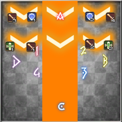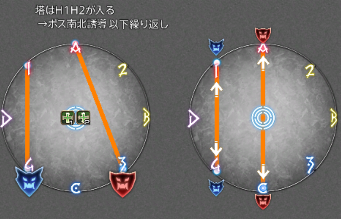 流れとしては、4人指定扇状範囲攻撃、ノーマルと同じ青ボスから予兆の>>>向き側の外周から、巨大扇状範囲攻撃、散開・頭割、ノックバック+散開・頭割です。