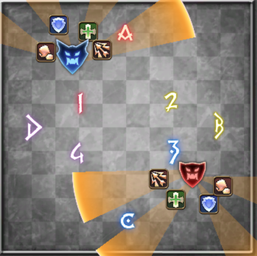 つまり、巨大扇状範囲攻撃の安全地帯で、赤青チームに分かれて散開か頭割を処理するギミックです。