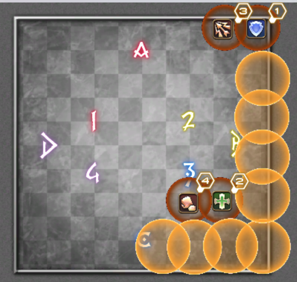 ここでは、中央に安置を作るように1回目を散開処理し、2回目は、開けておいたフィールド中央側へ回避が楽です。
